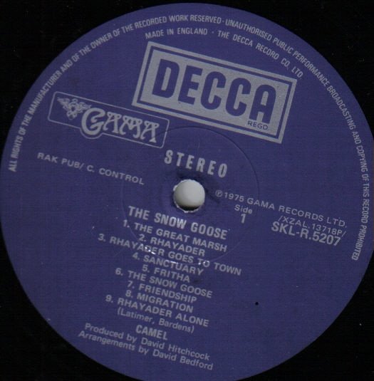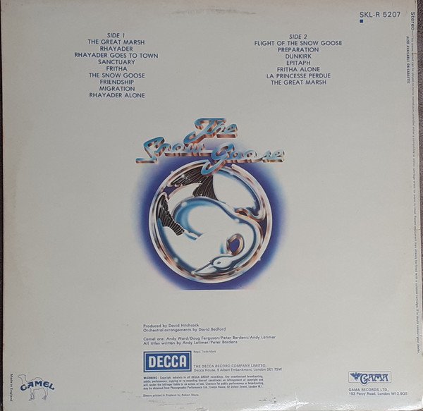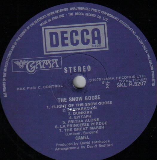 Slight label variation to other UK releases. Issued in a fully laminated sleeve printed by Robert Stace and with an insert printed by Senol Printing Limited. "The Snow Goose" was inspired by the short story of the same title, written by Paul Gallico in 1941. Made in England