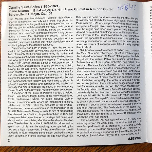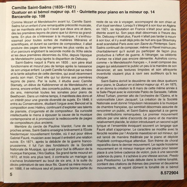 Camille Saint-Saëns - Piano Quartet In B Flat Major / Piano Quintet In A Minor / Barcarolle In F Major