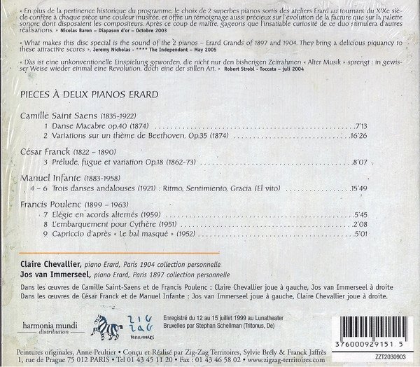 Recorded 12 - 15 July 1999, Lunatheater Bruxelles Claire Chevallier plays: piano Erard, Paris 1904 Jos Van Immerseel plays: piano Erard, Paris 1897 This release is a reissue of https://www.discogs.com/release/15567717-Saint-Sa%C3%ABns-Franck-Infante-Poulenc-Claire-Chevallier-Jos-van-Immerseel-Pi%C3%A8ces-%C3%A0-Deux-Pianos