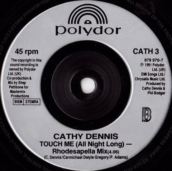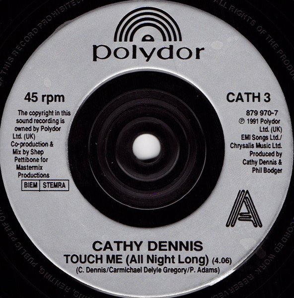 ℗ 1991 Polydor Ltd. (UK) © 1991 Polydor Ltd. (UK) Marketed and Distributed in the U.K. by Polydor Ltd. Co-production and mix for Mastermix Productions. also available on: [url=https://www.discogs.com/Cathy-Dennis-Touch-Me-All-Night-Long/release/215139]12"[/url]/[url=https://www.discogs.com/Cathy-Dennis-Touch-Me-All-Night-Long/release/209483]cd maxi single[/url]/[url=https://www.discogs.com/Cathy-Dennis-Touch-Me-All-Night-Long/release/139711]cassette single[/url]/ Taken from the Polydor album '[m=99336]' Runouts are stamped Channels are not listed on the release. Printed duration side A (4:06) on label does not match the actual duration (3:27).