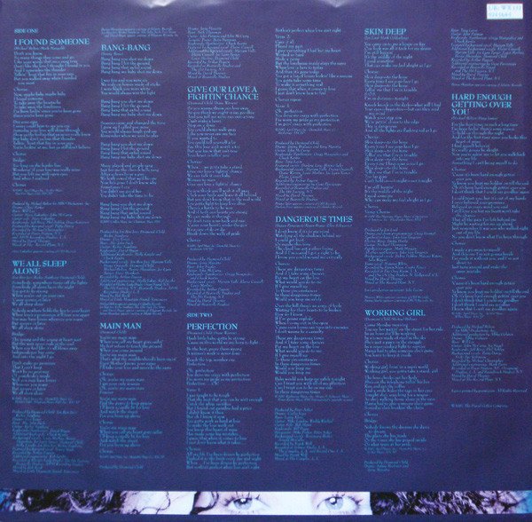 A1 (c) 1985 Recorded at Power Station, N.Y. & A&M Recording Studios, L.A., Mixed at The Record Plant, N.Y. A2 (c) 1987 Recorded at Electric Lady Studios, The Hit Factory, Bearsville Studios, A&M Recording Studios, Mixed at Mountain Sound, Vancouver. A3 (c) 1966 Recorded at Electric Lady Studio, Giant Sound, N.Y., The Hit Factory, N.Y., Bearsville Studios, A&M Recording Studio, L.A., Mixed at Little Mountain Sound, Vancouver. A4 (c) 1987 Recorded at Bearsville Studios and The Hit Factory, N.Y., Mixed at Bearsville Studios. A5 (c) 1987 Recorded at Bearsville Studios and The Hit Factory, N.Y., Mixed at Bearsville Studios. B1 (c) 1987 Recorded at Bearsville Studios and The Hit Factory, N.Y., Mixed at Bearsville Studios. B2 (c) 1987 Recorded at Schnee Studio, L.A., The Complex, L.A., and Record One, L.A., Mixed at The Complex, L.A. B3 (c) 1986 Recorded at The Grey Room, L.A. and One On One Studios, N. Hollywood, C.A., Mixed at The Record Plant, N.Y. B4 (c) 1987 Recorded at Bearsville Sound and The Hit Factory, N.Y., Mixed at The Record Plant, N.Y. B5 (c) 1987 Recorded at Power Station, N.Y., Oceanway Studios, L.A. and Soundtrack Studios, N.Y., Mixed at The Record Plant, N.Y. (p) & (c) 1987 The David Geffen Company. Some copies issued with a big white rectangular sticker on front. Issued with custom inner sleeve. [Additional runout information:] Runouts are stamped, everything after the side-identifiers (including the cut#: A#/B# - if present) is faintly hand-etched. Different to this version: [r1136855] (this version has publishing notes on labels).