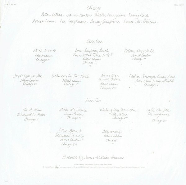 ©1975 CBS Inc./℗1969, 1970, 1972, 1973, 1974, 1975 CBS Inc. UK LP pressings (2 are known and listed here) are the ONLY ones that had 13 tracks instead of 11, adding Never Been In Love Before (off Chicago VIII) as A6 and I'm A Man (off 1st album, but actually an edited version seemingly different from the 1969 single release) as B1. Only the Netherlands-only cassette reissue in the Nice Price series (mid 80s) also had these 13 tracks but then in a totally different running order (see [r=2849750]) 69222 is on the front cover and the sticker, CBS 69222 is on the spine and the top-right of the insert, S 69222 is on the labels. The sticker on the front cover does not list the tracks, which span 15 lines, in the order they appear on sides 1 and 2. Two tracks (A2 and B5) span 2 lines, hence 13 tracks in total.