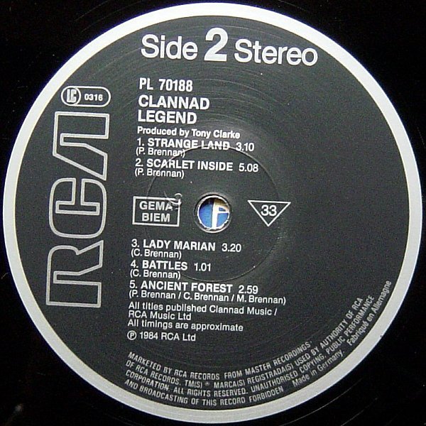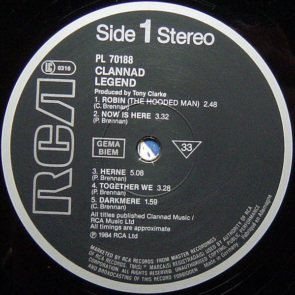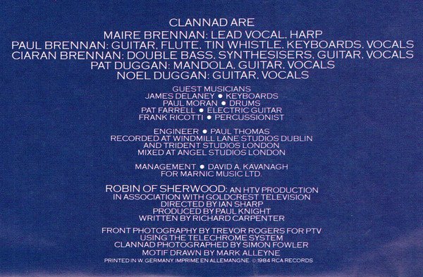 Insert gives a synopsis of the HTV Production 'Robin Of Sherwood' as well as describing the cast and their characters. © 1984 RCA Records. Printed in Germany Imprime en Allemangne. Belgique/Belgie: Distributed by RCA S.A. Deutschland vertrieb durch RCA Schallplatten GmbH. France: Distribué par RCA S.A. Italia: Distributed by RCA S.P.A. Nederland: Distributed by RCA B.V. U.K.: Distributed by RCA Ltd. Management for Marnic Music Ltd. All titles published by Clannad Music / RCA Music Ltd. Runout strings are stamped until -1 incl. Made In Germany, the parts in between are etched.