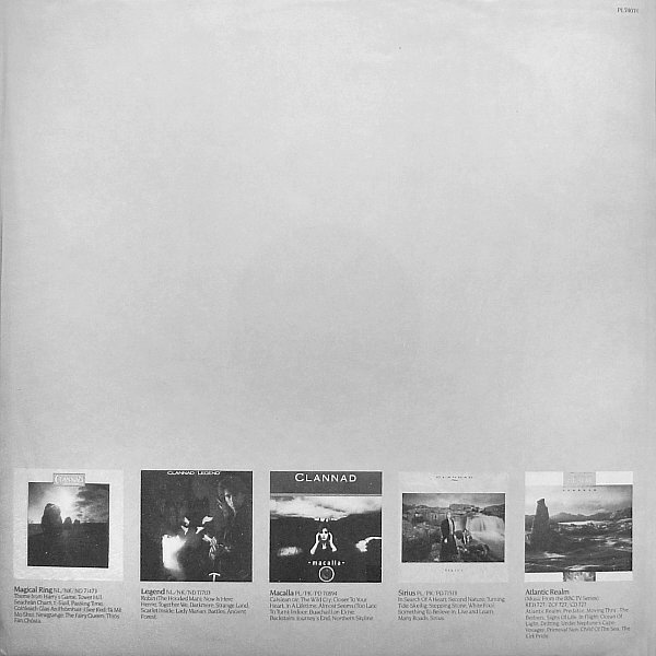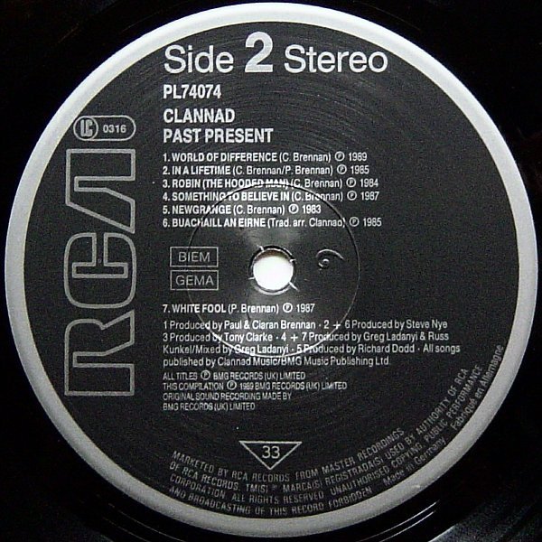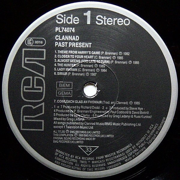 Matt finish sleeve - otherwise identical to Glossy sleeve. This version has the RCA "block letters logo" on the labels. Another version exits with the round RCA logo on the labels - see [r=7722712]. Tracks A1 and B6 recorded and mixed at Windmill Lane Studios, Dublin. Tracks A2, A3 and B2 recorded at Powerplay Studios, Ridge Farm Studios and Windmill Lane Studios, Dublin. Mixed at Windmill Lane Studios. Tracks A4 and B1 recorded at Rockfield Studios, Wales and Real World Studios, Bath. Mixed at Real World Studios, Bath. Track A5 recorded at Windmill Lane Studios, Dublin, and Trident Studios, London. Tracks A6, B4 and B7 recorded at Rockfield Studios, Wales, and Livingston Studios, London. Mixed at The Complex, Los Angeles, U.S.A. Tracks A7 and B5 recorded and mixed at Nova Studios, London. Track B3 recorded at Windmill Lane Studios, Dublin and Trident Studios, London. Mixed at Angel Studios, London. All titles ℗ 1989 BMG Records (UK) Limited. This compilation ℗ 1989 BMG Records (UK) Limited. © 1989 BMG Records (UK) Limited. All titles published by Clannad Music Ltd/B.M.G. except "Harry's Game" published by Television Music Ltd. Made in Germany