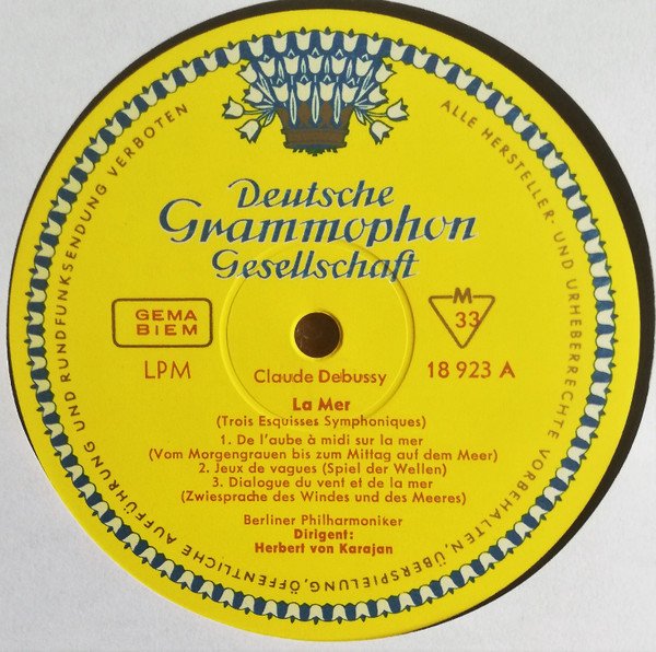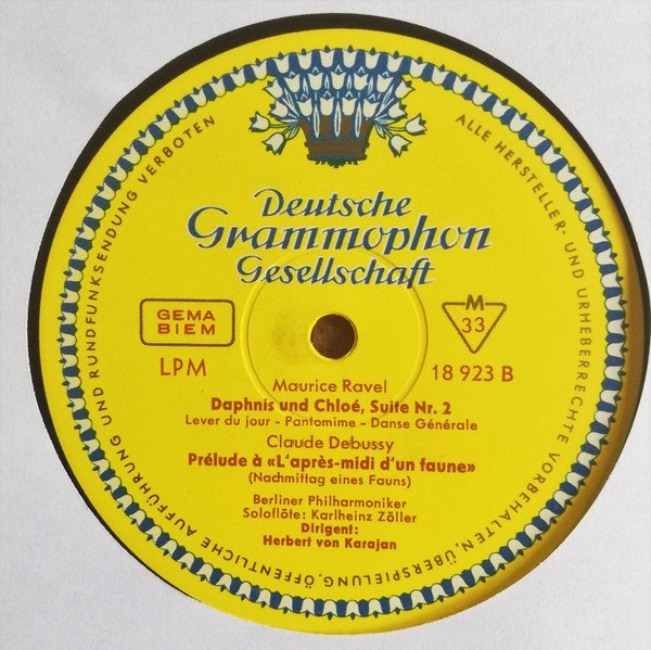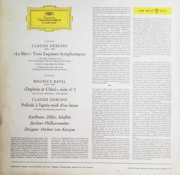 Liner notes in German, English and French Logo: Deutsche Grammophon Gesellschaft Labels with tulip borders Repress with mastering in October and December 1965 (K5 and M5 in runouts). [url=https://www.discogs.com/Debussy-Ravel-Berliner-Philharmoniker-Herbert-von-Karajan-La-Mer-Pr%C3%A9lude-LApr%C3%A8s-Midi-DUn-Faune-Dap/release/11228984]German original issue[/url] has mastering in July and August 1964 (G4 and H4 in runouts).