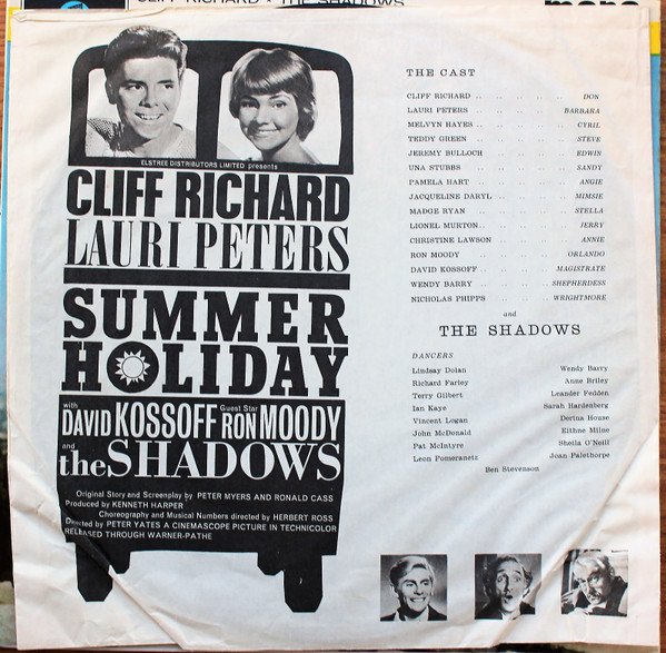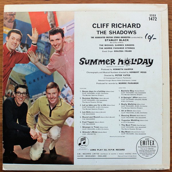 "Cliff Richard - The Shadows with Grazina Frame" are named as artists for all tracks on both labels. [a520248] appears courtesy of [l5320]. Front laminated sleeve with flipback tabs. Printed inner sleeve with film story, stills, cast and line-up. From the Elstree Distributors film "Summer Holiday" A Cinemascope Picture in Technicolor. Released through Warner-Pathé Distributors Limited. E.M.I. Records Limited controlled by Electric & Musical Industries Limited Columbia Graphophone Co.Ltd. Recording first published 1963. Made in Gt. Britain. (Labels). Made and printed in Great Britain. (Back Cover). Durations do not appear on this release.