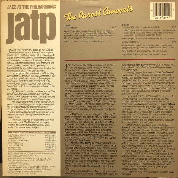 Side A recorded late Sept. 1953, exact date & location unknown B1 recorded April 23, 1946, at the Embassy Auditorium, Los Angeles B2 recorded May 27, 1946, at Carnegie Hall, NYC ℗ © 1983 Polygram Classics, Inc.