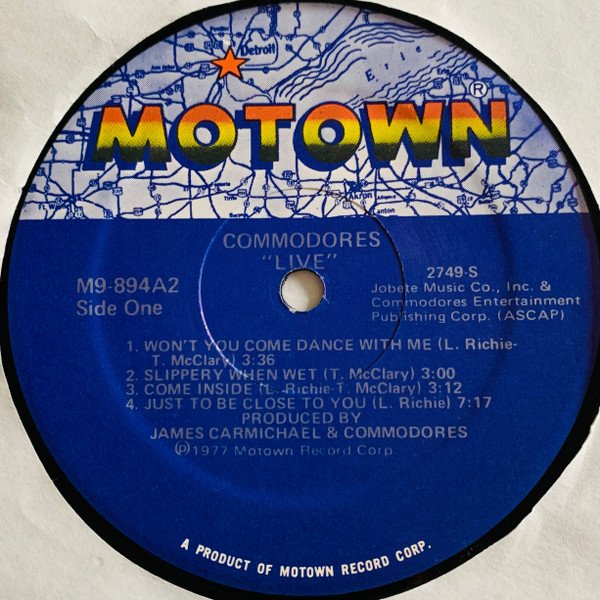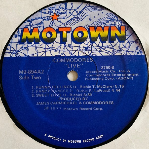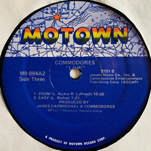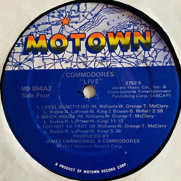 Set is auto-coupled - Record 1 has sides One and Four,/ Record 2 has sides Two and Three The runouts are etched; ▀ stands for something scratched but illegible. Special thanks to James Carmichael, the "humble genius", Cal Harris, the "wizard of audio" and Suzee "Sanchez" Ikeda, the "Kung Fu Queen". Our sincere thanks and gratitude to the following: Quentin Perry, Promoter and Taurus Productions of Atlanta, Georgia. Bill Washington, Promoter and Dimensions Unlimited of Washington, D.C. Commodores' production staff: Lenny Guice, Gary Johnson, Vincent Morgan, Rudy Rotuno, "Hot Dog" Williams and Cecil Willingham. The Mean Machine: David Cochrane, Darrell "DJ" Jones, Harold Hudson and Winston Sims and thank you America!!!!!!!