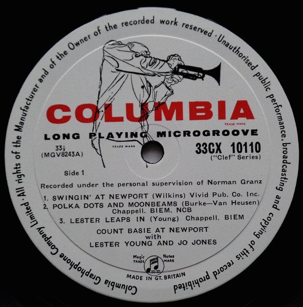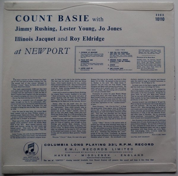 White label / red COLUMBIA, with trumpet player logo. Sleeve of thin card, fully laminated, having curved flip-back. Made in Great Britain Front + label = COUNT BASIE AT NEWPORT WITH...etc Spine = Newport Jazz Festival, 1957 (12) ------------------- As from the notes printed on the backside: (Recording first published in 1957)