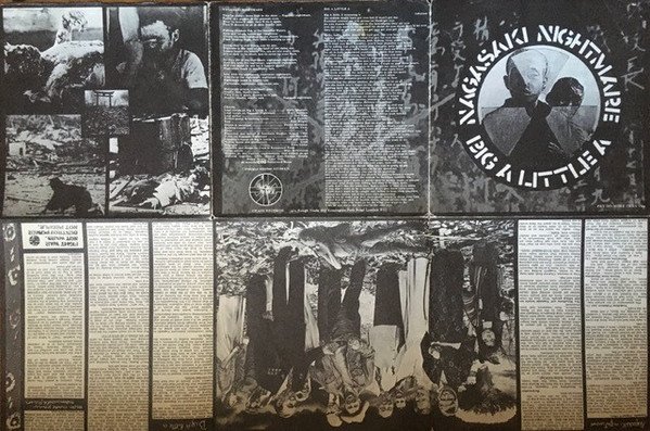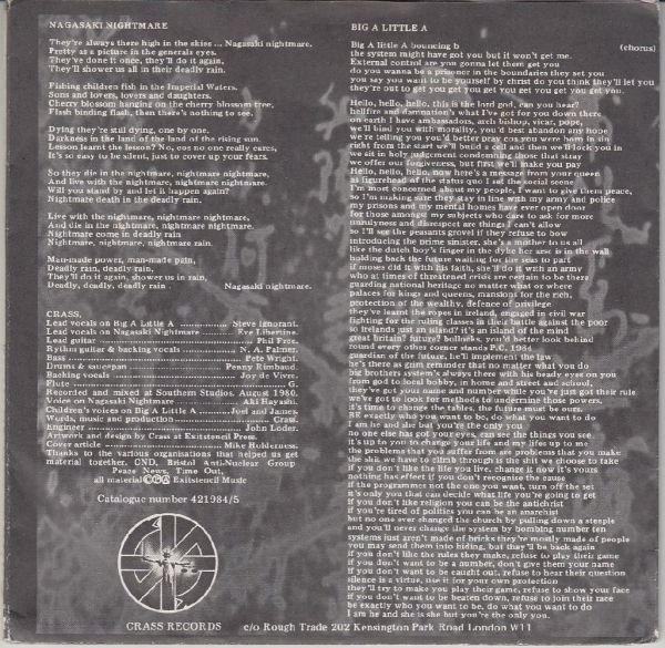 Included a black and white '反战 Anti-War' sew on patch in varying styles which Crass printed at Dial House. Some patches had a black border on the edges while others did not. Recorded and mixed at Southern Studios, August 1980. Artwork and design by Crass at Exitstencil Press All material ©℗Ⓐ Exitstencil Music. Crass Records c/o Rough Trade 202 Kensington Park Road London W11 Fold-out poster sleeve containing lyrics, images and political information.