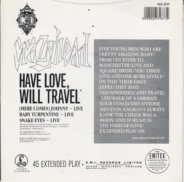 Five young men/who are pretty amazing baby/from Leicester to Manchester/live and square/bring you three live/and one more lively/on this their first eepee/they had Thunderbird/and travelled/back of a German coach/did anyone mention angels?/I always knew the cheese was a moon/and if music is the food of love/extended play on. Jerry Cornelius/February 1989 [Rear sleeve features old EMI "45 Extended Play" design & credits including "Emitex" advert.]