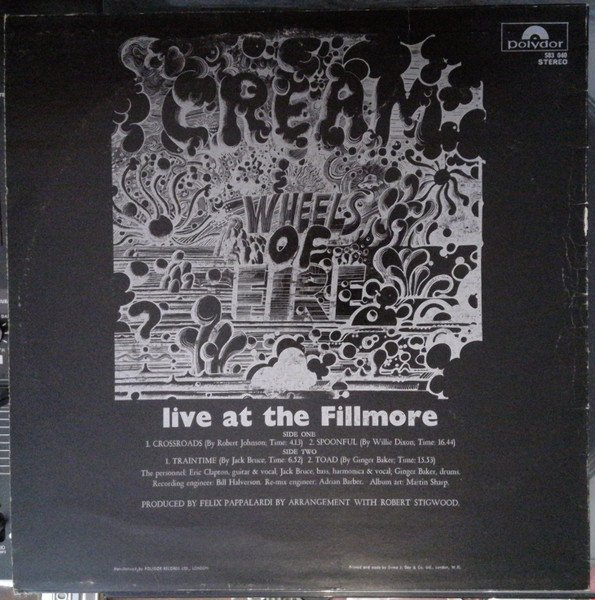 Live at the Fillmore. Produced by Felix Pappalardi by arrangement with Robert Stigwood. MADE IN ENGLAND 583 040 on cover, 583040 on labels. This pressing exists with textured labels (as in current images) and smooth labels with the identical design and layout features.