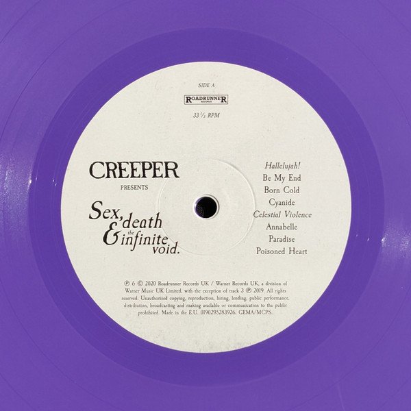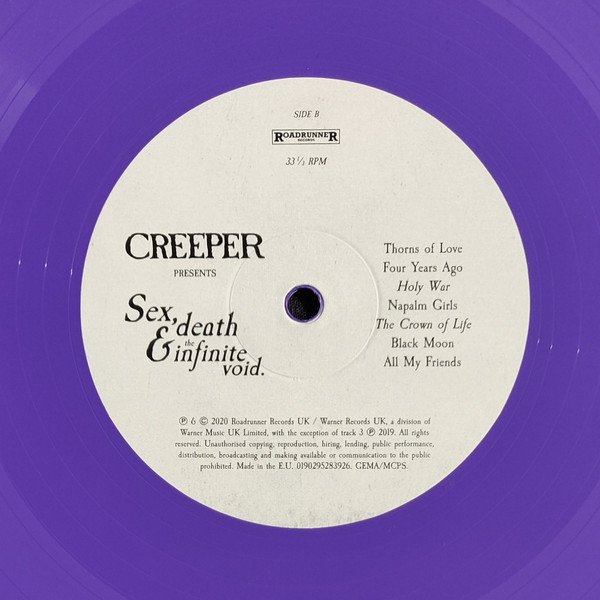 Limited Edition black sleeve with white print (as opposed to the white sleeve with black print of [url=https://www.discogs.com/Creeper-Sex-Death-The-Infinite-Void/release/15701867]the 'standard' edition[/url]) Durations do not appear on release; those given here have been obtained by digitising the vinyl. Timing for B7 includes the 20-second silence and the 65-second untitled spoken section that follows the song 'All My Friends' Runouts: '1+' is mirrored