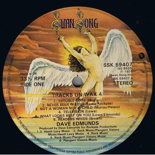 Original UK release in semi-glossy cover. First catalogue number on cover and labels, 2nd (US Cat.#) in parentheses on cover rear and labels. [Rear cover:] Recorded at Eden Studios London March 1978 © 1978 Atlantic Recording Corporation A Swan Recording (w) [Warner logo] A Warner Communications Company. Printed in England by Gothic Press Ltd., London SE9 2EQ. [Labels:] ℗ 1978 Swan Song Inc. A Warner Communications Company (w) [Warner logo] Made in UK Publishing: • A1, A3: Heath Levy Music • A2: Rock Music/Plangent Visions Music/Heath Levy Music • A4, B5: Rock Music • A5, B1: Rock Music/Plangent Visions Music • A6, B3: Plangent Visions Music • B2: Copyright Control • B4: Isalee Music Runouts are etched, except detached single numbers at 3 o'clock are stamped.