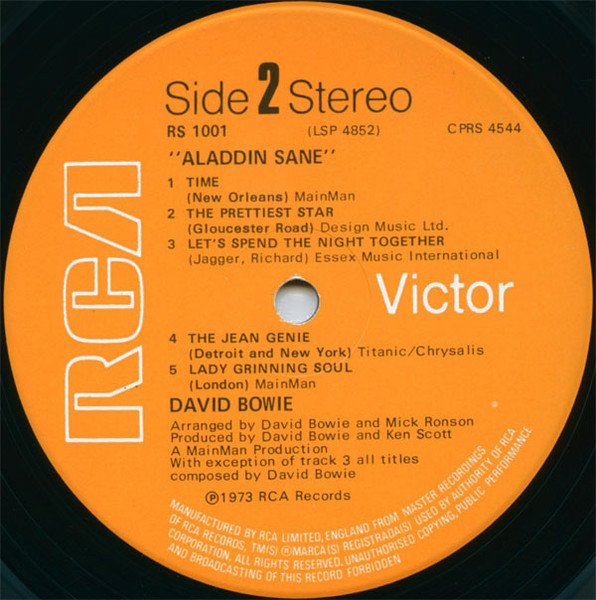 This album comes in a matte thick cardboard gatefold sleeve with printed cardboard inner sleeve containing lyrics for the songs except for the cover version "Let's Spend The Night Together". Initial copies included a David Bowie Fan Club application card. Recorded at Trident Studios, London. A MainMan Production Linda Lewis appears by courtesy of [l=Reprise Records]. Bowie's harmonica playing is uncredited on the LP. The record label has the following in parentheses for the tracks being the locations where the songs were composed: A1 Watch That Man (New York) A2 Aladdin Sane (1913-1938-197?) (R.H.M.S. "Ellinis") A3 Drive-In Saturday (Seattle - Phoenix) A4 Panic In Detroit (Detroit) A5 Cracked Actor (Los Angeles) B1 Time (New Orleans) B2 The Prettiest Star (Gloucester Road) B4 The Jean Genie (Detroit and New York) B5 Lady Grinning Soul (London) Interpak by Shorewood Packaging Co. Ltd., England [Publishers] A1 to B1, B5: © 1973 MainMan B2: © 1970 Design Music Ltd. B3: Essex Music International B4: © 1972 Titanic/Chrysalis ℗ 1973 RCA Records Manufactured by RCA Limited, England from master recordings of RCA Records. Matrix / Runout: 'CPRY 4543-3T' and 'CPRY 4544-3T' stamped, everything else etched.