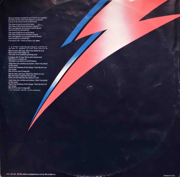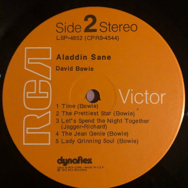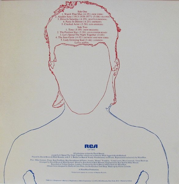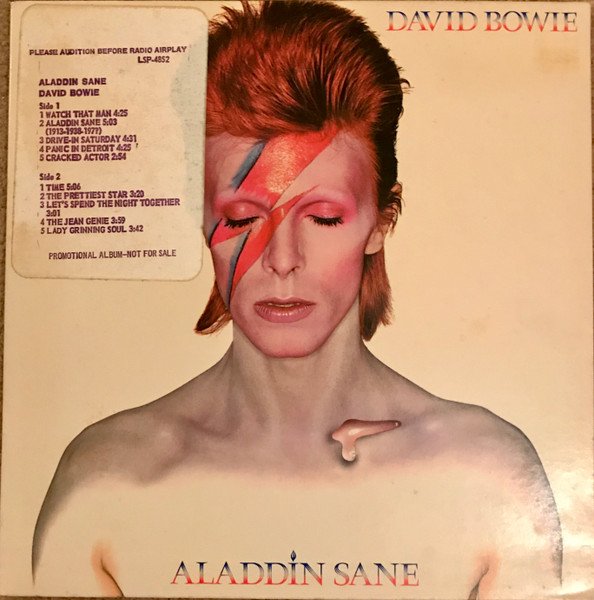[l406973] Dynaflex pressing, identified by stamped capital "I" in runouts. Gatefold sleeve. The first sleeves for 'Aladdin' were custom printed in 7 colors, including the silver ink used on the inside. These can be identified from the blue of the front lettering and back outline, which appear in a true ("royal") blue on the original, while subsequent printings used a standard 4-color CMYK process and have a distinctly greenish (cyan) color to the blue lettering and outline, while the shoulders are less silver. Issued with printed inner sleeve. May include David Bowie Fan Club Application Blank insert. Promotional copies have a white 4"x5.75" sticker on the first printing front sleeve with track-list and timings (different from those shown above) and the notation, "PLEASE AUDITION BEFORE RADIO AIRPLAY" (see Images). There are also promotional copies with text: NOT FOR SALE promotion use only etched in the top left corner of the back of the cover. (see photo). Back cover gives locations in parentheses after the track titles (except for B3): A1 (New York) A2 (Ellinis) A3 (Seattle-Phoenix) A4 (Detroit) A5 (Los Angeles) B1 (New Orleans) B2 (Gloucester Road) B4 (Detroit and New York) B5 (London) Recorded at Trident Studios, London. Produced for MainMan Album Cover designed ... for the Kitchen Tool Shop. A MainMan Production. Linda Lewis appears by courtesy of Reprise Records. © 1973, RCA Records, New York, N.Y. • Printed in U.S.A. A1 to B1 & B5: © 1973 MainMan (ASCAP) B2: © 1973 Design Music Ltd. All rights administered by Hill and Range Songs, Inc. (BMI) B4: © 1972, Vaudeville Music Ltd. (BMI) dynaflex TM(s) ® RCA CORP. - MADE IN U.S.A. ℗ 1973 RCA Records Runouts are stamped except "/-" is etched in Variant 1.
