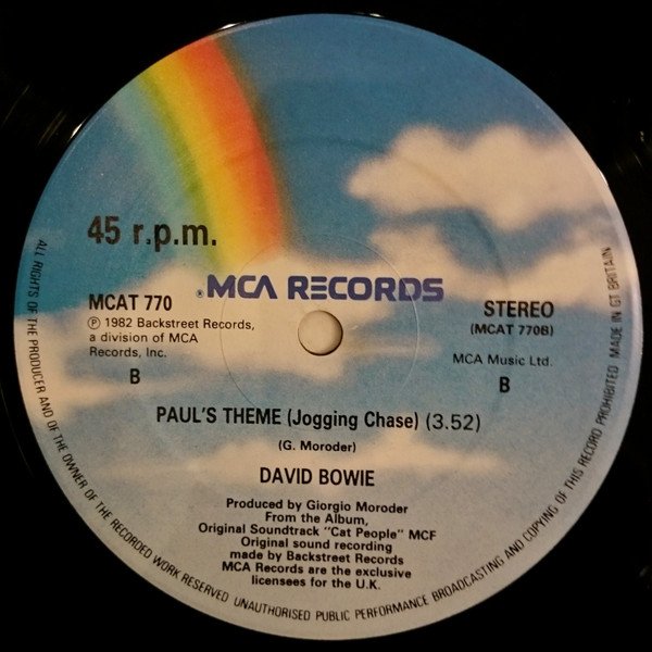 UK edition which incorrectly lists David Bowie as artist on side B Same design label as : [r=571309], though that is the version without the David Bowie artist credit on side B From the album, Original Soundtrack 'Cat People' MCF 3138 Runouts are etched, except "3B" (variant 2 and 3), "C" (variant 3) and "1" (variant 4) which are stamped.