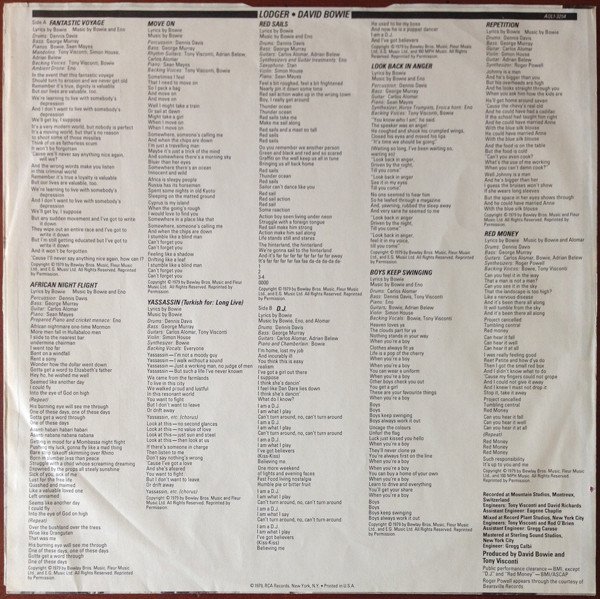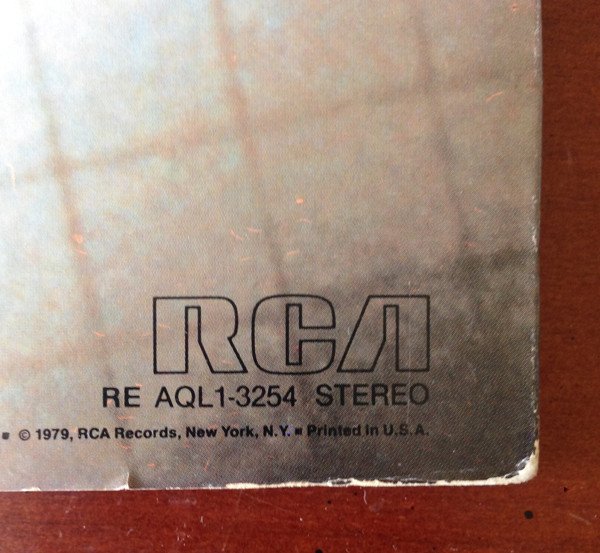 This version pressed at [l=RCA Records Pressing Plant, Indianapolis], denoted by "I" stamp in runouts. Remainder of runouts mostly etched, mastering and plating letters (e.g., A1, B2) may be stamped. This version does not include "..than no sense at all" etching on side B. Issued in RCA gatefold sleeve, with printed inner sleeve with lyrics and credits. Issued on black dog RCA Victor labels. Catalog number RE AQL1-3254 on back of sleeve only. Catalog number AQL1-3254 on spine, top right side of gatefold center, and labels. Some copies have track list sticker on back of sleeve. Some copies have a gold or black promotional stamp on the sleeve. Recorded at Mountain Studios, Montreux, Switzerland. Mixed at Record Plant Studios, New York City. Mastered at Sterling Sound Studios, New York City. Roger Powell appears through the courtesy of [l73530] ℗ & © 1979 RCA Records. Printed in U.S.A. Track copyrights on inner sleeve: A1, A2, A5, B2, B3: Copyright © 1979 by Bewlay Bros. Music, Fleur Music Ltd., and E.G. Music Ltd. A3, A4, B4: Copyright © 1979 by Bewlay Bros. Music and Fleur Music Ltd. B1, B5: Copyright © 1979 by Bewlay Bros. Music, Fleur Music Ltd., E.G. Music Ltd., and 100 MPH Music. Public performance clearance - BMI, except B1 and B5 - BMI/ASCAP