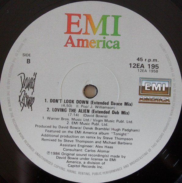 Includes poster. A1, B2 published by EMI Music Publ. Ltd. B1 published by Warner Bros. Music Ltd./ Virgin Music Publ. Ltd. Featured on the EMI America Album & Tape [m=49182] ℗ 1984 Original sound recording made by David Bowie under license to EMI America Records, a division of Capitol Records, Inc. © 1985 EMI America Records, a division of Capitol Records, Inc. Manufactured in the UK by EMI Records Limited.