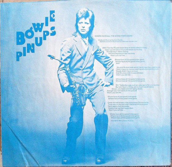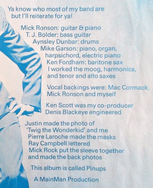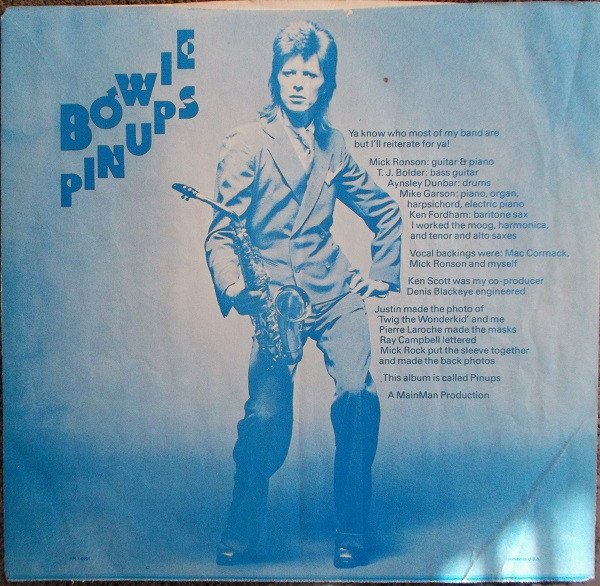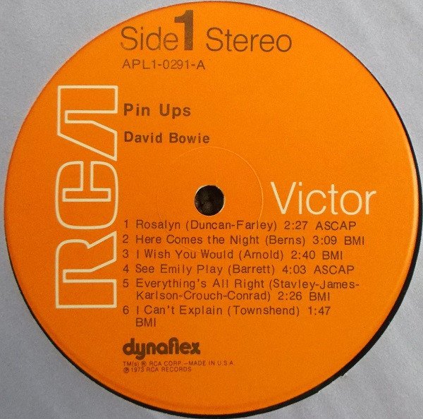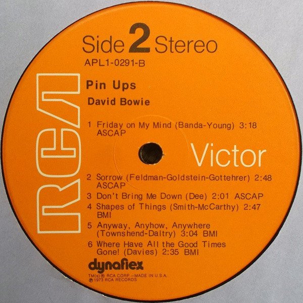 First [l406973], pressing, identified by serifed capital "I" stamped in runouts. Remainder of runouts stamped. This version has misprinted labels. Errors on the first printing of both labels resulted in two label variants for each side of the Indianapolis pressings: The first set of labels had errors on both sides: An incorrect 1:47 timing for track A6 and an incorrect "Banda-Young" songwriting credit for track B1 (this version). Another version has A6 timing corrected to 2:07 but retaining the "Banda" error for track B1 (see [r=7979379]). Another version exists with the B1 writing credit corrected to "Vanda-Young" but with the 1:47 timing for track A6 (see [r=13328373]). The fully corrected version has track A6 timing as 2:07 and track B1 writing credit to "Vanda-Young" (see [r=11369954]). Released with printed inner sleeve with artwork, credits, and lyrics of track B6 only, reproduced with kind permission of Belinda (London) Ltd Copyright © 1965 Davray Music,Ltd. Titled on front cover and inner sleeve: "Pinups" Title on labels, rear sleeve (top right-hand corner) and spine: "Pin Ups" Also in the text on inner sleeve: "This album is called Pinups." Artist on labels, spine: David Bowie Track title variations: A5 on back cover: Everythings Alright B5 on back cover: anywayanyhowanywhere B6 on inner sleeve: Where Have All The Good Times Gone Issued on orange RCA Victor Dynaflex labels. Jacket with RCA and MainMan logos on back. © 1973 RCA Records ℗ 1973 RCA Records A MainMan Production. Groups credited on back cover notes: [url=/artist/260959]Pretty Things[/url]: A1, B3 [url=/artist/275791]Them[/url]: A2 [url=/artist/262455]Yardbirds[/url]: A3, B4: Syds [url=/artist/45467]Pink Floyd[/url]: A4 [url=/artist/379710]Mojos[/url]: A5 [url=/artist/196766]Who[/url]: A6, B5 [url=/artist/293531]Easybeats[/url]: B1 [url=/artist/379709]Merseys[/url]: B2 [url=/artist/94078]Kinks[/url]: B6