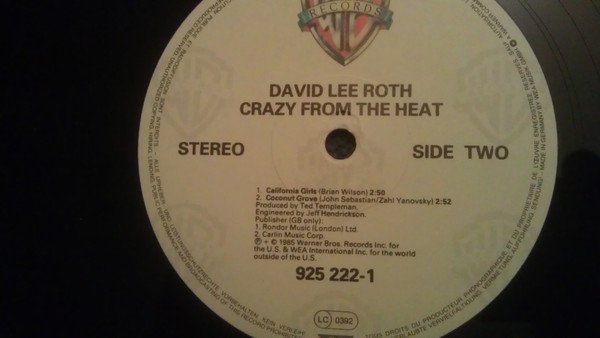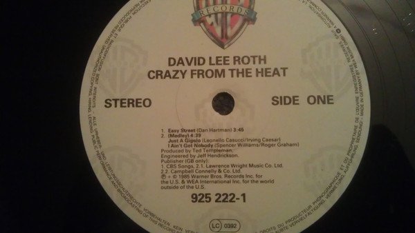 ℗ + © 1985 Warner Bros. Records Inc. for the U.S. & WEA International Inc. for the world outside of the U.S. Publisher (GB only): A1. CBS Songs, A2.1. Lawrence Wright Music Co. Ltd. A2.2. Campbell Connelly & Co. Ltd. B1. Rondor Music (London) Ltd. B2. Carlin Music Corp. Rear on bottom right : raised embossed Warner Logo WB Records LC 0392 Rear top right : Also available on cassette 925 222-1 G 925 222-4 France: WE 341
