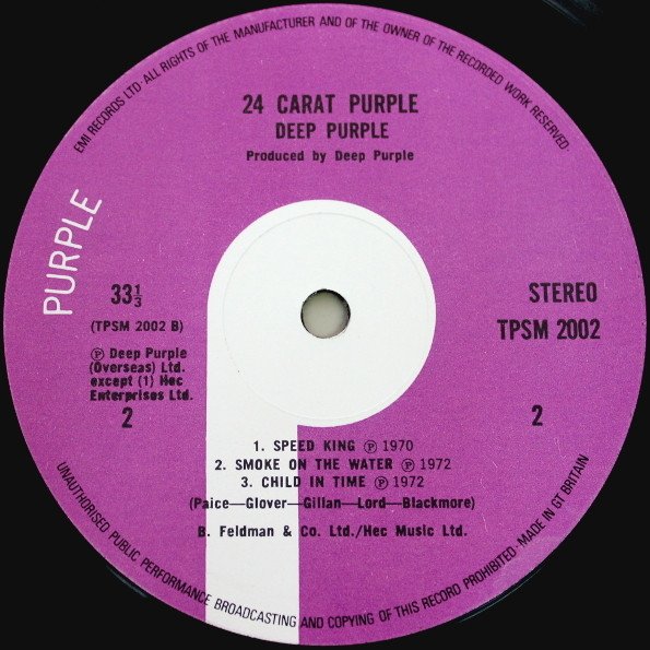 A1 is mis-spelled as 'Woman From Toyko' on all the labels of the 1975 UK versions of this release. All titles published by Feldman / HEC Music. Albums the tracks were taken from: A1 - Who Do We Think We Are (1973) A2 - Fireball (1971) A3, B2, B3 - Made In Japan (1972) A4 - Machine Head (1972) A5 - was recorded live in Japan (1973) B1 - Deep Purple In Rock (1970) Black letter shadowing is here: [r34691748]