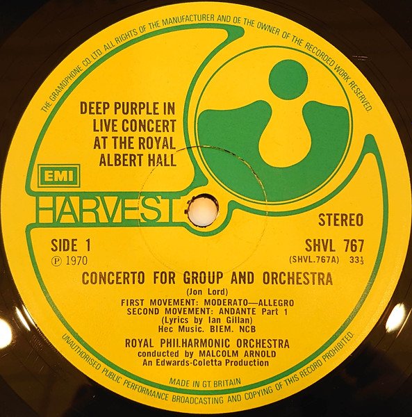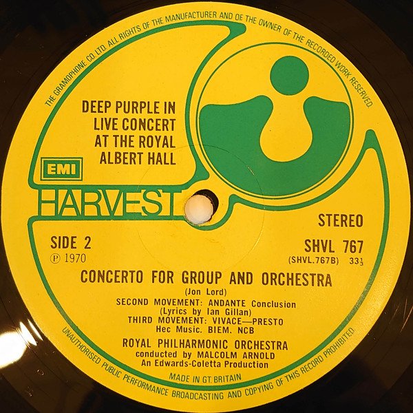 Similar to [r=15445974] but this version has 'The Gramophone Co Ltd' on both labels. Boxed EMI logo on labels and on the sleeve. ℗ 1970 Live Concert At The Royal Albert Hall. An Edwards-Coletta Production. De Lane Lea Recording Studios Mobile Unit Outside laminated gatefold sleeve. 'MADE IN GT. BRITAIN' on labels. 'Made and Printed in Great Britain' inside the gatefold. 'Printed and made by the E. J. Day Group, London and Bedford' on the back sleeve.