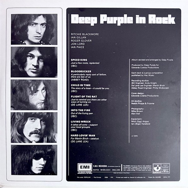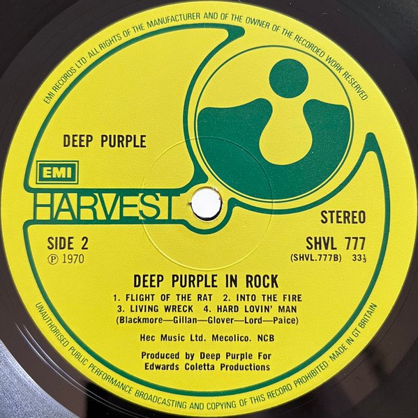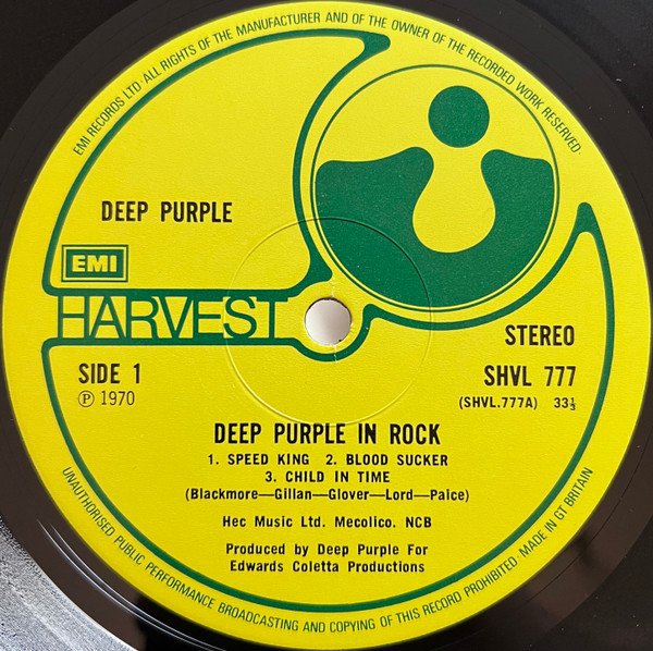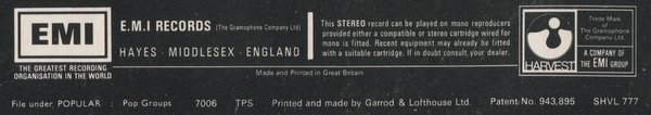 This is 1976 - 1980 UK reissue. Actually there are practically no any obvious visual differences between 1976 - 1980 pressings, except insignificant color variations in label background shades of yellow, which vary from yellow-green to lemon-yellow and the figurate sections (incl. logo and the rim text) which vary from green to dark green or even shades of blue. The pressing year could be approximated by date codes indicated on the inner sleeves. The main difference from the previous issues: 1) Runouts: A4 / B3. A new master for Side A (A-4) was used for these reissues. The master again was cut by [url=https://www.discogs.com/artist/465253-Harry-Moss] Harry T. Moss[/url] - EMI mastering and cutting engineer. Other main identifiers: - Laminated gatefold sleeve with 'Printed and Made by Garrod & Lofthouse Ltd.' in most cases have an additional keyline box around the EMI and Harvest logos on the front of the sleeve. But the 1st sleeve variant with a single bold line around the logos is still valid. - Inner sleeve: a) EMI inner sleeve with 'Care Of Your Record' box high centre, 'Important Notice' box in low centre and 'Made In Great Britain' above 'Patent Nos. 1125555' near the bottom (since about late 1974 to 1978); b) EMI inner sleeve with 'Care Of Your Record' box high centre, 'Important Notice' box in low centre and 'Made In Great Britain' above 'Patent Nos. 1125555' with date code near the bottom (since about 1978 to 1980); c) EMI inner sleeve with 'Care Of Your Record' box high centre, 'Thinking of giving someone a record as a gift?' bubble mid centre, 'Important Notice' box in low centre, 'Made In Great Britain' above 'Patent Nos. 1125555' and with date code near the bottom (since about 1980 to 1982); - The upper rim text begins with 'EMI RECORDS LTD.' (since about May 1974); -The inscription 'MADE IN GT. BRITAIN' is inlined with the lower rim text (at the end) under the circular bottom line (since about May 1974 to about 1981); - Runouts: A4 / B3 (since about 1976 to 1980); - The boxed 'EMI' logo on labels (since about June 1971); - Song listing in 2 lines on both sides (since about the second half of 1972); - The Ⓟ icon (under the 'Side A/B' indicator on labels) is the same size as the year '1970' to the right of it (since about December 1970 / January 1971). ℗ 1970 Produced for Edwards Coletta Productions Each track is a group composition Made and Printed in Great Britain Printed and Made by Garrod & Lofthouse Ltd. Recording Studios: IBC: Tracks A1, A3, B2, B3 Abbey Road: Track A2 De Lane Lea: Tracks B1, B4