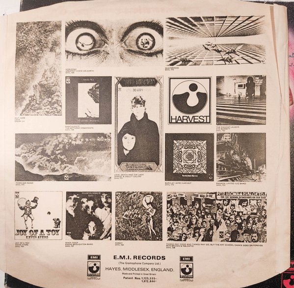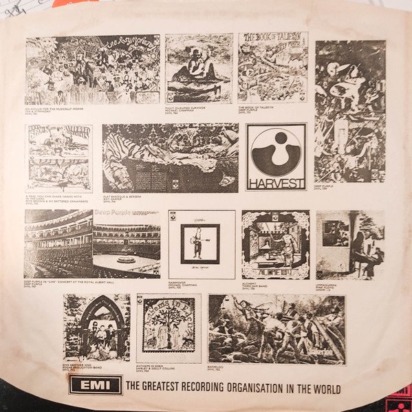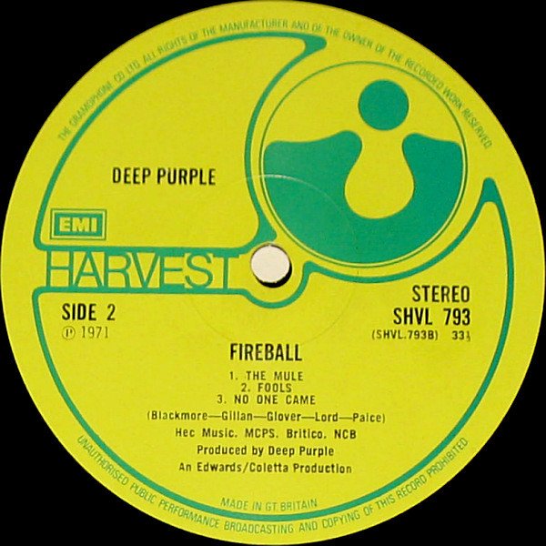 ‘Gramophone Co.’ variant labels, including e.g. – different text positioning from [r=469215] – different fonts from [r=5811241] and [r=8233684] – different A-side label from [r=10342134] First edition with a darker textured gatefold sleeve depicting five b&w live photos inside, while later editions are paler and smooth. Rough labels with ‘The Gramophone Co. Ltd.’ at the beginning of the rim text. Initial quantities came with a lyrics insert printed in purple on both sides and in a generic polylined EMI inner sleeve depicting other artists' current releases. The second catalogue number appears on the rear sleeve. Album devised and produced by Deep Purple for Edwards/Coletta Productions. Made and printed in Great Britain.Runouts are stamped except for PEK which is etched.