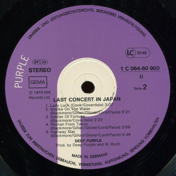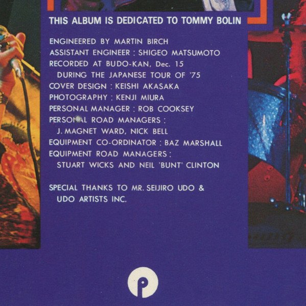 [Back cover]: This album is dedicated to Tommy Bolin Printed in Germany ℗ & © 1977 Deep Purple Overseas Ltd. [Labels]: ℗ 1978 EMI Records Ltd. Made in Germany Recorded at Budo-Kan Dec.15 during the Japanese tour of '75 Embossed EMI logo on back cover.