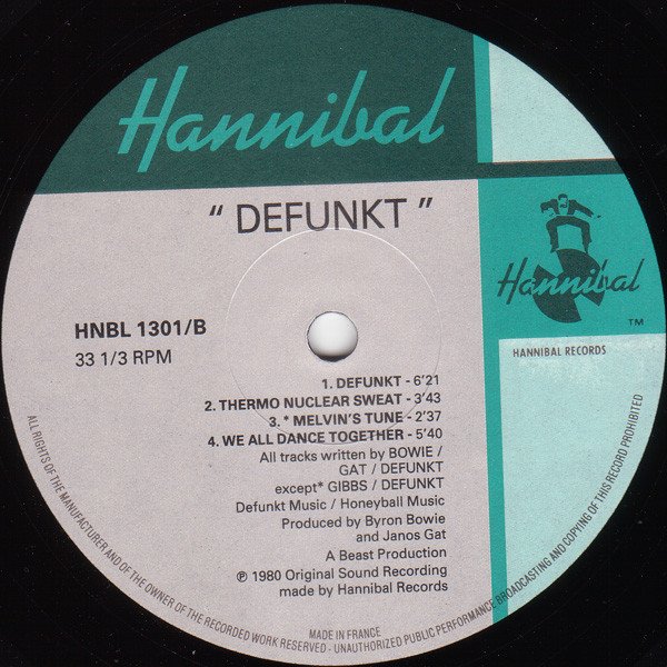 Sleeve: Recorded at Big Apple Studios, New York. All tunes published by Defunkt Music/ Hamilcar Music, All tunes ASCAP. Special thanks to the Squat Theatre, Special thanks to Alan Patt. Ted Daniel appears courtesy of Ujama Records. New York. Dedicated To Martin Fischer. ℗ 1980 Hannibal Records Ltd. © 1980 Hannibal Records Ltd. Hannibal Records, P.O. Box 742 London W11 3LZ. Tel: 01 727 7480 c/o Carthage Records, Box 667, Rocky Hill NJ 08553. Labels: Defunkt Music / Honeyball Music A Beast Production ℗ 1980 Original Sound Recording made by Hannibal Records Made in France Similar release without barcode, identical labels: [r=18275626]