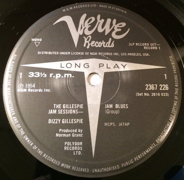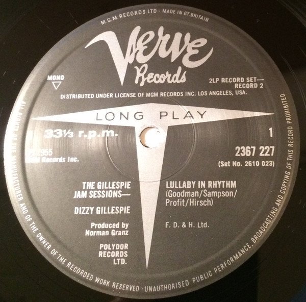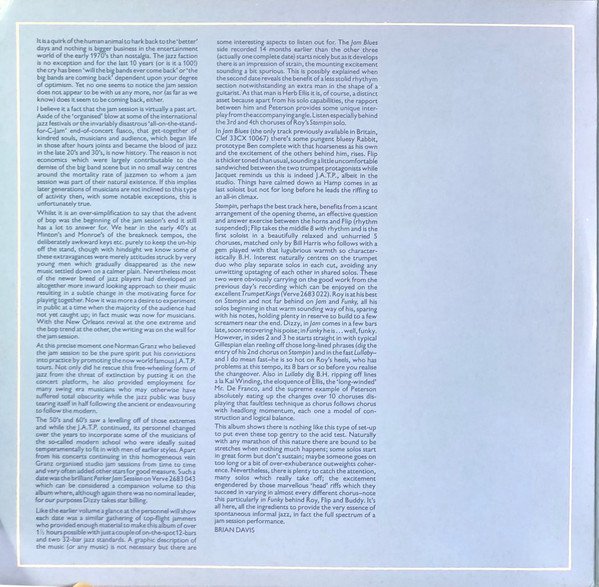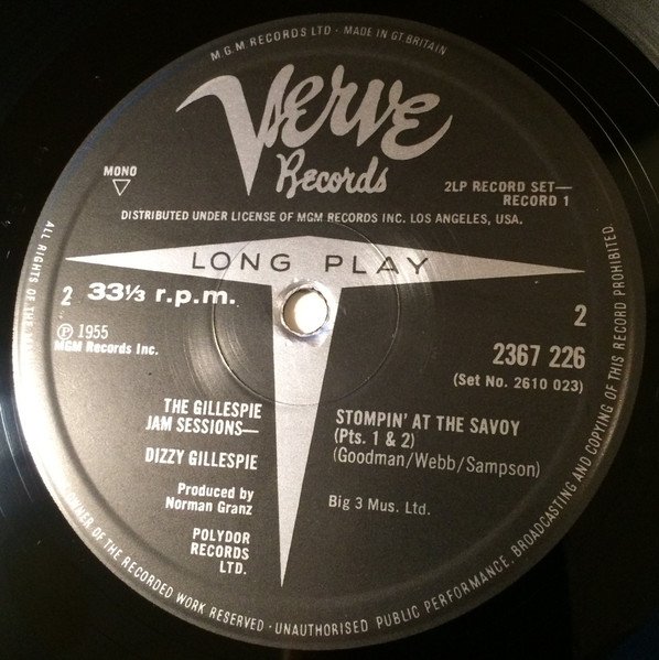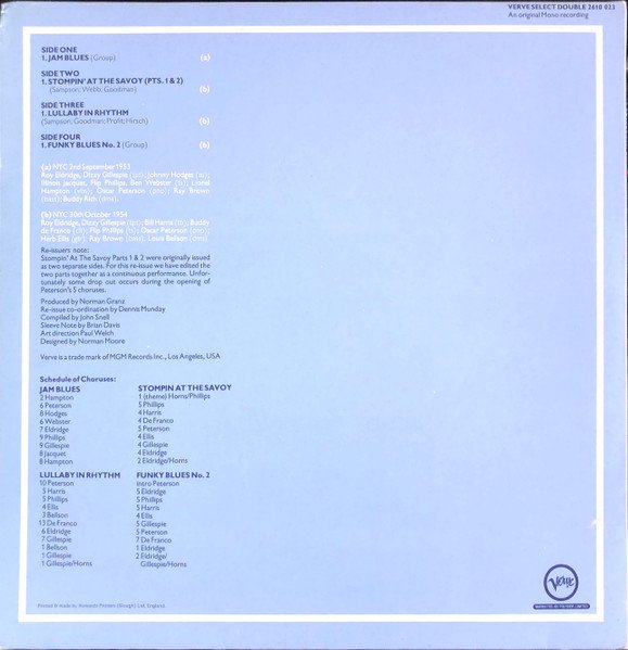 Comes in a gatefold sleeve. Side A recorded in NYC 2nd September 1953. Sides B, C & D recorded in NYC 30th October 1954. Distributed under license of MGM Records Inc. Los Angeles, USA Verve is a trade mark of MGM Records Inc., Los Angeles, USA Track B shown as "Stompin' At The Savoy (Pts. 1 & 2)" on the back cover. Publishers: A, D - MCPS. JATAP B - Big 3 Mus. Ltd. C - F. D. & H. Ltd.