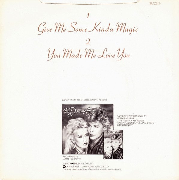 Published by Oscar Music Ltd. / Virgin Music (Publishers) Ltd. ℗ 1982 WEA Records Ltd. © 1982 WEA Records Ltd. A Warner Communications Company Manufactured in the UK Taken from the forthcoming album "The Dollar Album"; [url=http://discogs.com/Dollar-The-Dollar-Album/release/1276550]Record DTV1[/url]; Cassette DTV41 The runouts are etched.