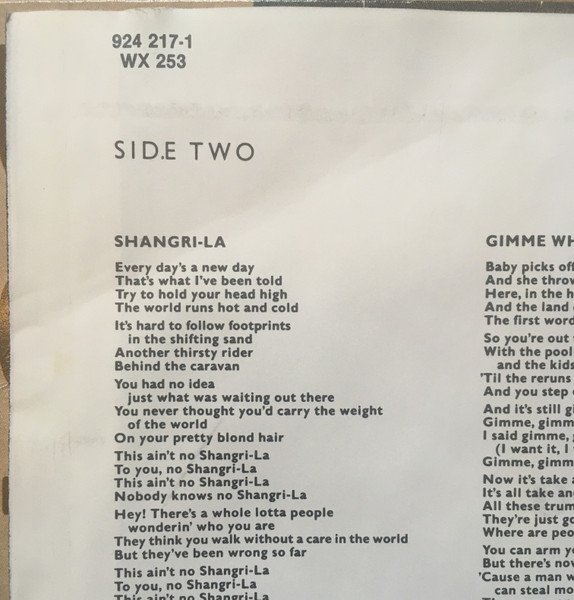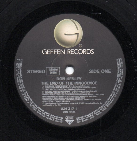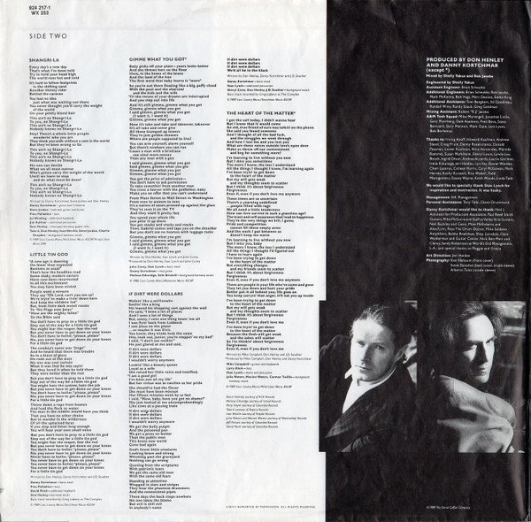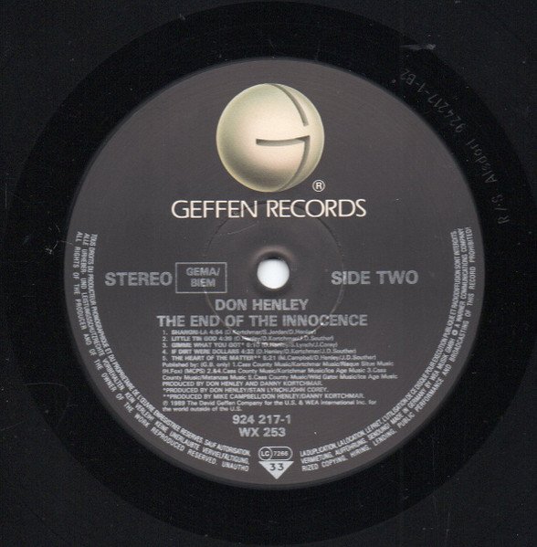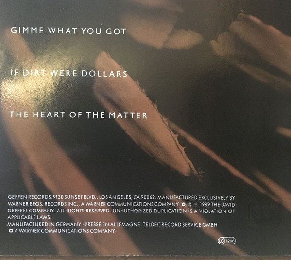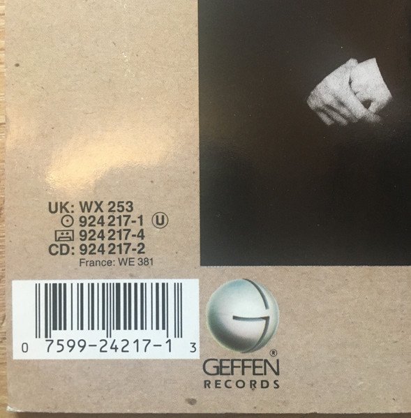 [Notes] Runouts "R/S Alsdorf 924217-1" and side identifier are stamped, everything else is etched. Comes with the printed inner sleeve. This is a label variant of the R/S Alsdorf pressing containing 7 rows of text with publishing rights under the track list on labels. [r=939458]/ r939458:The other R/S Alsdorf pressing with different labels' layout, e.g. 5 rows of text with publishing rights under the track list on labels. [r=11465524]/ r11465524: Sonopress pressing, also has different price codes in comparison to the R/S Alsdorf pressings. A5, B2 and B4 recorded by Greg Ladanyl at The Complex [Back cover] © ℗ 1989 The David Geffen Company Manufactured exclusively by Warner Bros. Records Inc. Manufactured in Germany ... Teldec Record Service GMBH [Record labels] Made in Germany by Warner Musik GmbH [Publishers on labels] A1 Cass County Music / BMG Music Publishing Ltd. A2, A3, A5 Cass County Music / Kortchmar Music A4 Cass County Music / Grey Hare Music B1 Cass County Music / Kortchmar Music / Risque Situe Music (H.Fox) (MCPS) B2, B4 Cass County Music / Kortchmar Music / Ice Age Music B3 Cass County Music / Matanzas Music B5 Cass County Music / Wild Gator Music / Ice Age Music
