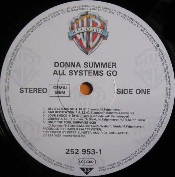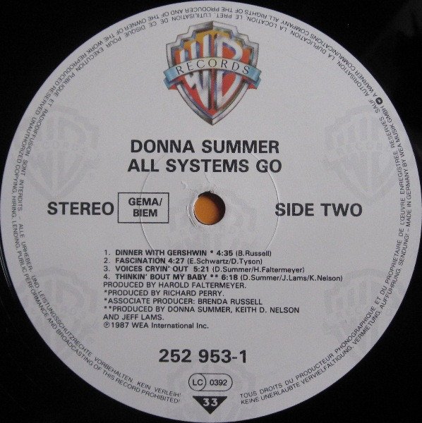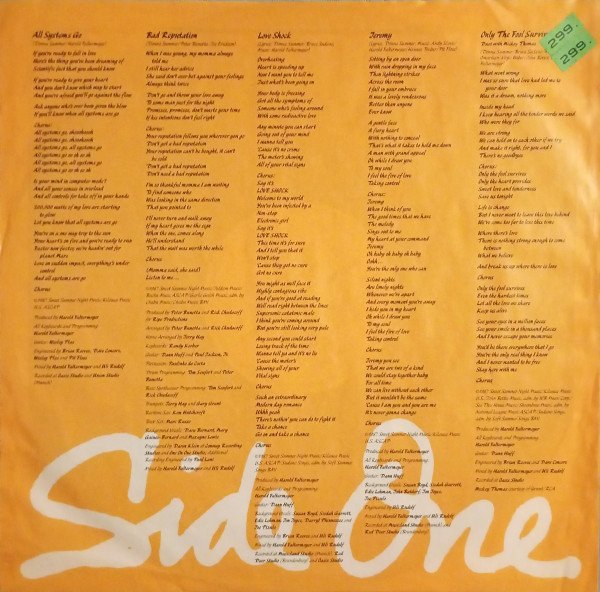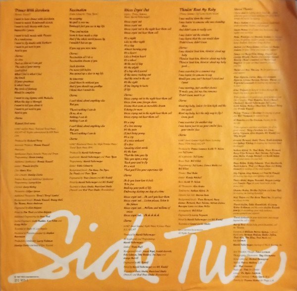 © ℗ 1987 WEA International Inc. Sleeve: Manufactured in Germany by Record Service GmbH, AlsdorfLabels: Made in Germany by WEA Musik GmbH, A Warner Communincations Company.Issued with custom inner sleeve with lyrics. A1: (C) 1987 Sweet SUmmer Night Music/Kilauea Music US. ASCAP Recorded at Oasis Studio and Union Studio (Munich)A2: (C) 1987 Sweet Summer Night Music/Juldam Music/Buchu Music ASCAP/Garlic Gulch Music, adm. by Chubu Music/ Chubu Music BMI. Produced for Ripe Productions Engineered at Conway Recording Studios and One On One StudioA3: (C) 1987 Sweet Summer Night Music/Kilauea Music US. ASCAP/Sudano Songs, adm. by Soft Summer Songs BMI Recorded at Musicland Studio (Munich), Red Deer Studio (Brandenburg), and Oasis StudioA4: (C) 1987 Sweet Summer Night Music/Kilauea Music US. ASCAP Recorded at Musicland Studio (Munich) and Red Deer Studio (Brandenburg)A5: (C) 1987 Sweet Summer Night Music/Kilauea Music US./ John Bettis Music, adm. by WB Music Corp./See This House Music/Shoombree Music, adm. by National League Music ASCAP/ Sudano Songs, adm. by Soft Summer Songs BMI Recorded at Oasis StudioB1: (C) 1987 Geffen Music/Rutland Road Music ASCAP. All rights administered by WB Music Corp. Recorded at Studio 55, Los Angeles; Mastered at Precision LacquerB2: (C) 1987 Blackwood Music, Inc./High Frontier Music/David Tyson Music BMI Recorded at Oasis Studio, Musicland Studio (Munich) and Red Deer Studio (Brandenburg).B3: (C) 1987 Sweet Summer Night Music/ Kilauea Music US. ASCAP Recorded at Oasis Studio, Musicland Studio (Munich) and Red Deer Studio (Brandenburg).B4: (C) 1987 Sweet Summer Night Music/Lamsong Music/FDN Music ASCAP Recorded at Sound Casle Studio