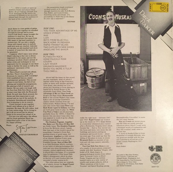 Includes 8 page booklet with TAB transcriptions of Duck Baker's compositions. Publishers: A1, A4, B7: Chappell & Co. Ltd. A2, A3, A5, A7 to B1, B3, B5: Kicking Mule / Sonet A6: Shapiro Bernstein B2: Campbell Connelly B4: Southern M.P.Co.Ltd. B6: Ascherberg, Hopwood & Crew