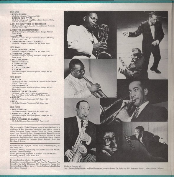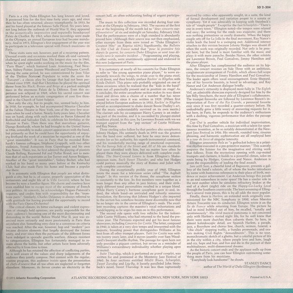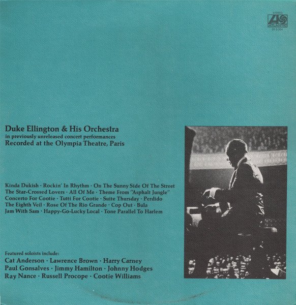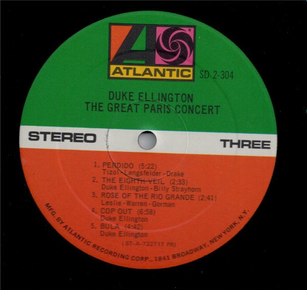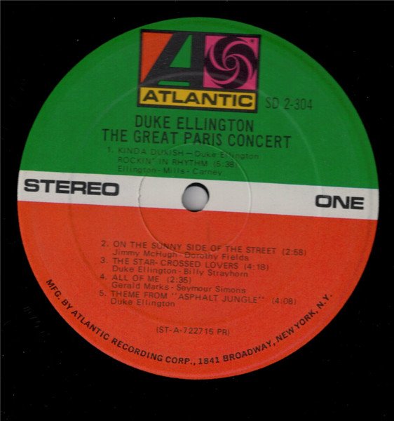 (C) 1973 Atlantic Recording Corporation Printed In U S A Label print with address 1841 Broadway, New York, N.Y. was used from 1968 to 1973 (---> see LJC) Duke Ellington & His Orchestra in previously unreleased concert performances recorded at The Olympia Theatre, Paris, Recorded on February 1st, 2nd and 23rd, 1963 Original Pressings Issued in Textured Gatefold Cover