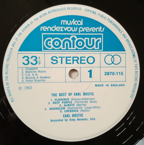 On the sleeve: 2870 115 contour Recorded by King Records Cincinnati/U.S.A. musical rendezvous limited 16 St George Street London W1 On the labels: musical rendezvous presents contour Stereo 2870-115 ℗ 1963 Made in England