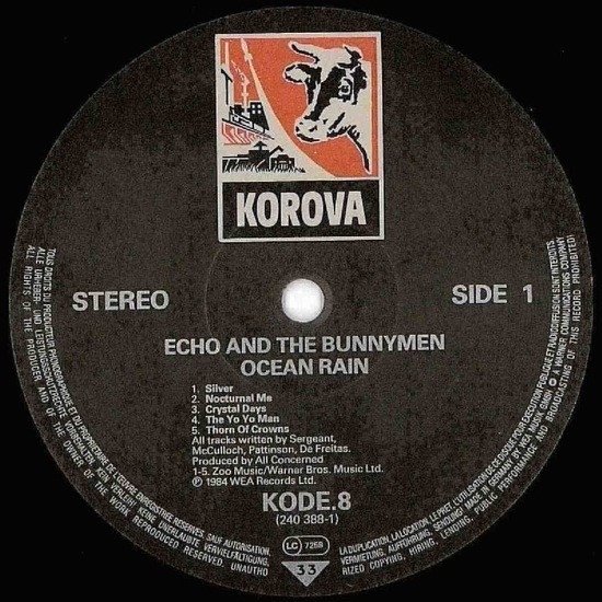 First pressing issued with a glossy picture sleeve without a barcode on rear. Includes a printed purple-blue matte inner sleeve with credits and an orchestra photo. Catalog numbers: KODE 8 (on back cover) KODE.8 (on labels) Kode 8 (on inner sleeve and spine) 240 388-1 (on back cover and labels) [On back cover]: © 1984 WEA Records Ltd. ℗ 1984 WEA Records Ltd. Manufactured in Germany by Record Service, GmbH, Alsdorf. Pressé en Allemagne par Record Service. GmbH, Alsdorf. [Warner 'W' logo] A Warner Communications Company. [On labels]: Made in Germany by WEA Musik GmbH [Warner 'W' logo] A Warner Communications Company [On inner sleeve]: Recorded at Studio Des Dames, Paris & Amazon Studios, Liverpool. All songs [...] Zoo Music/Warner Bros. Music Limited Runouts: 'R/S Alsdorf 240388-1 A2' and 'R/S Alsdorf 240388-1 B2' are stamped, everything else is etched