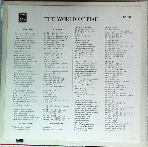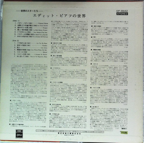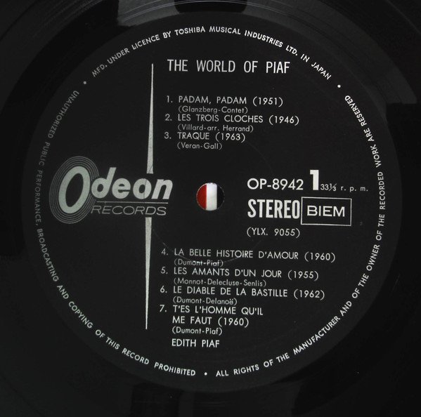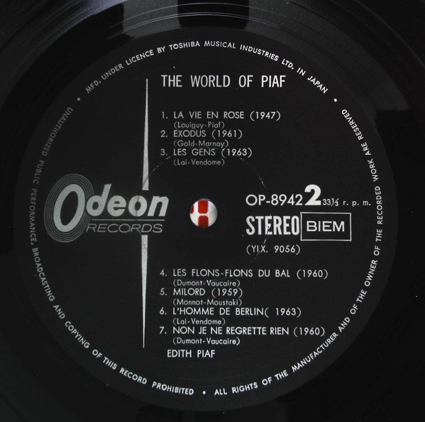Comes with 6-page French/Japanese lyrics booklet. Probably released in 1972/1973. Worldwide Series A1: (1951) BIEM. A2: (1946) Southern Mus. Mecolico. BIEM. A3: (1963) ℗ 1963 Chappell & Co. Ltd. A4: (1960) ℗ 1960 Southern Mus. Mecolico. BIEM. A5: (1955) Cinephonic Mus. BIEM. A6: (1962) ℗ 1962 BIEM. A7: (1960) ℗ 1960 Southern Music. BIEM. A8: (1955) Essex Mus. BIEM B1: (1947) Noel Gay. Mecolico. BIEM. NCB. B2: (1961) ℗ 1961 Chappell & Co. Ltd. B3: (1963) ℗ 1963 Southern Mus. BIEM. B4: (1960) ℗ 1960 BIEM. B5: (1959) ℗ 1959 Carlin Mus. Corp. Mecolico. BIEM. B6: (1962) ℗ 1962 Leeds Mus. Mecolico. BIEM. B7: (1963) ℗ 1963 BIEM. B8: (1960) ℗ 1960 S. Bernstein Ltd. Mecolico. BIEM. Uncredited informations: #B7 recorded on 7 April 1963