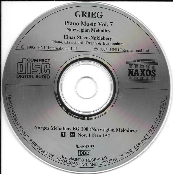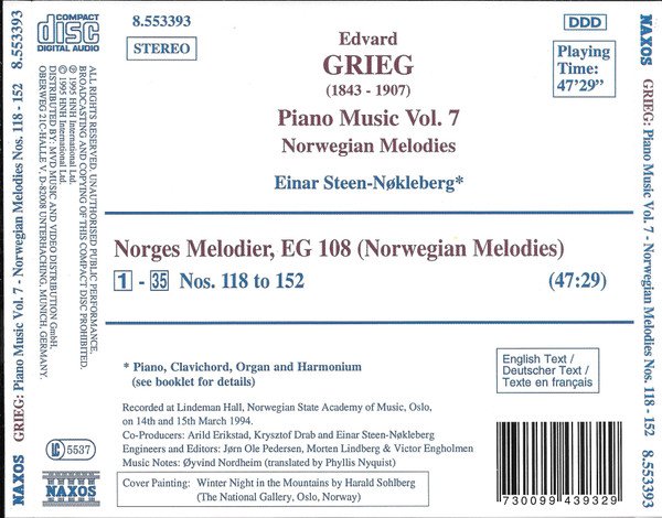 Playing Time: 47'29" Recorded at Lindeman Hall, Norwegian State Academy of Music, Oslo, on 14th and 15th March 1994. Cover Painting: Winter Night in the Mountains by Harald Sohlberg (The National Gallery, Oslo, Norway) Liner notes: German translation © 1995 Sven Precht; French translation © 1995 Frédéric Castello Photograph of Einar Steen-Nøkleberg: © Hæge Håtveit Moe ℗ 1995 HNH International Ltd. © 1995 HNH International Ltd. Distributed by MVD Music and Video Distribution GmbH. Oberweg 21C-Halle V, D-82008 Unterhaching, Munich, Germany CD comes packaged in a standard plastic jewel case, and includes a 16-page booklet with notes in English, German and French. This release is similar to [r7580176], but without Rights Society and no text "Made in Germany".