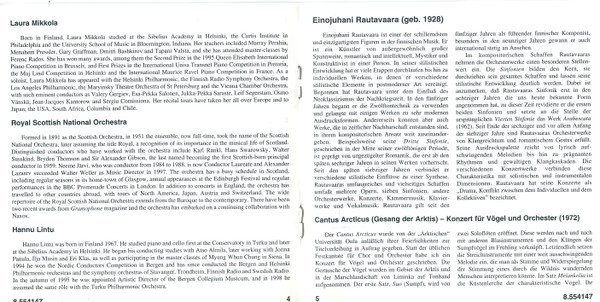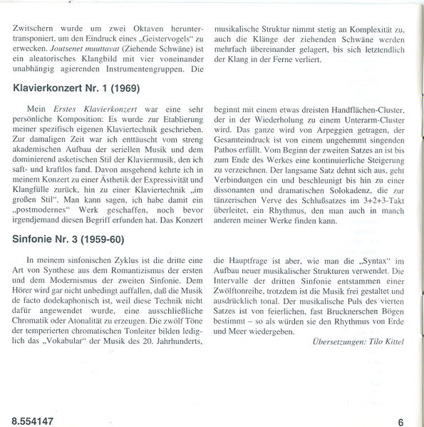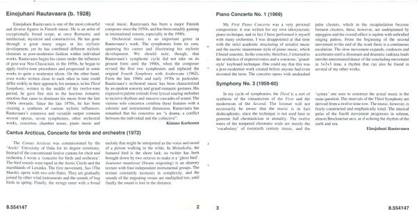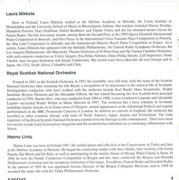 ℗ & © 1998. Recorded in Henry Wood Hall, Glasgow, from 13th to 15th August, 1997. Tracks 1 to 3, and 7 to 10 published by Warner/Chapell Music Finland. Tracks 4 to 6 published by Breitkopf & Härtel. Cover Painting courtesy Kari Walden. Made in E.C. [on back inlay card]. In standard jewel case with black tray and 8-page booklet with texts in English, German and French