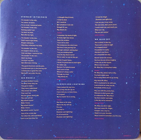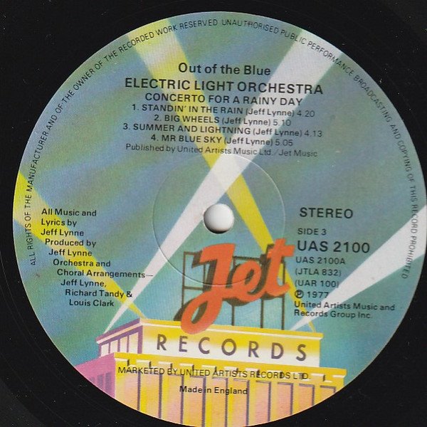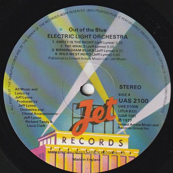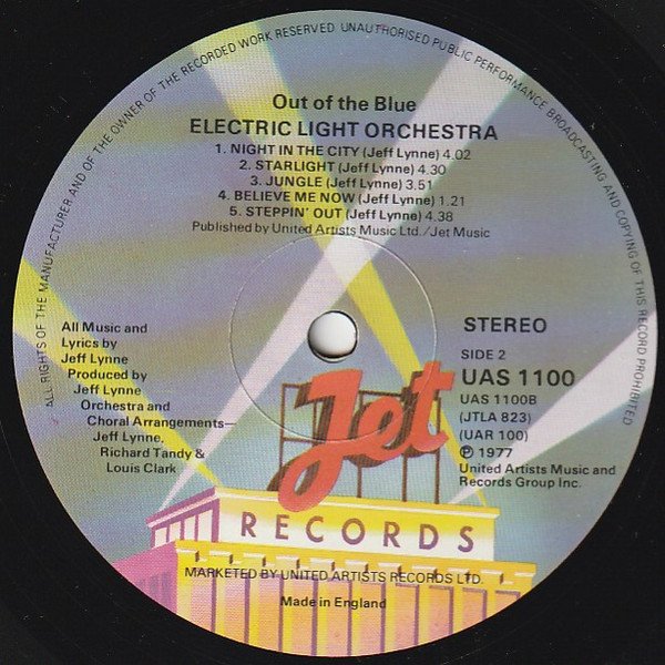 This is a variation of the UK pressing whereby the lacquer is cut only by "ALLEN" See [r=601218] for the release containing "KEV" See [r=16637841] for the release containing both "KEV" and "ALLEN" Catalog number on spine: UAR 100 Catalog number on back of sleeve: UAR 100 (JTLA 823) Some copies may have a sticker over or under (JTLA 823) stating: JETDP 400 Catalog number on Record 1 inner sleeve and labels: UAS 1100 (JTLA 823) (UAR 100) Catalog number on Record 2 inner sleeve and labels: UAS 2100 (JTLA 832) (UAR 100) Gatefold sleeve with two inner sleeves, poster and a push-out cardboard ELO space station. Information on labels: Published by United Artists Music Ltd./Jet Music ℗ 1977 United Artists Music and Records Group Inc. Marketed by United Artists Records Ltd. Made in England Information on sleeve: © ℗ 1977 United Artists Music & Records Group Inc. ® Trademarks owned by United Artists Music and Records Group Inc. and used by United Artists Records Limited under authorisation. Marketed by United Artists Records Printed and made by Garrod and Lofthouse Ltd. Patent No. 1224339 Information in runout: The matrix is stamped, except for "ALLEN" which is etched