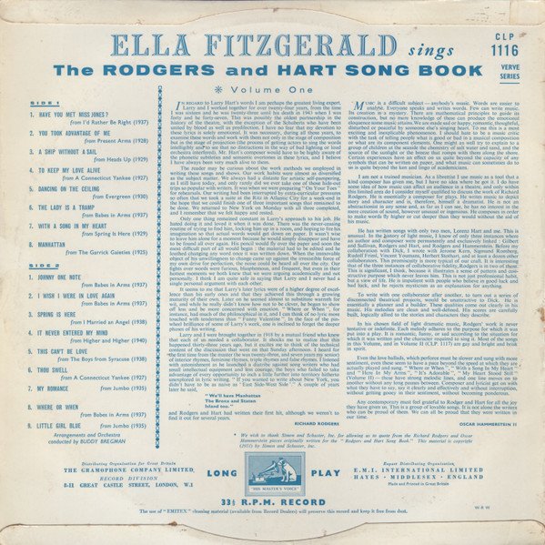 Arrangements and Orchestra conducted by Buddy Bregman. On labels the title appears as: 'The Rodgers and Hart Song Book-Vol. 1'; on front cover: 'Sings The Rodgers And Hart Song Book - Vol. 1'; on back cover: 'Sings The Rodgers And Hart Song Book Volume One'. Advertised as a new release in "From America comes...", Gramophone magazine, May 1957, back cover.