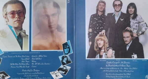 Gatefold sleeve. Original UK cover is DJLPX 1, and are used to this issue, where DJLPX 1 is printed on the spine. Labelsticker with DJH 20500 covers the original catno# on the back. Comes with 2 booklets, one containing the lyrics and another called scraps, both of which contain additional artwork and photographs. Also included is an A2 poster of the cover artwork. Engineered at Caribou Ranch, Colorado. Remixed at The Marquee Studios, London. Lettering Help at Bloomsbury Group. Illustration (C) Alan Aldridge. Davey Johnstone and Nigel Olsson appear by courtesy of The Rocket Record Company, Nigel Olsson also by courtesy of Drumork Productions. All selections published by Big Pig Music, Ltd. Made in England. DJM (Distributors) Limited. James House, 71-75 New Oxford Street, London WC1A 1DP. Distributed by Pye Records (Sales) Limited. (C) 1975 This Record Co. Limited. (P) 1975 This Record Co. Limited. Interpak by Shorewood Packaging Co. Ltd. England.