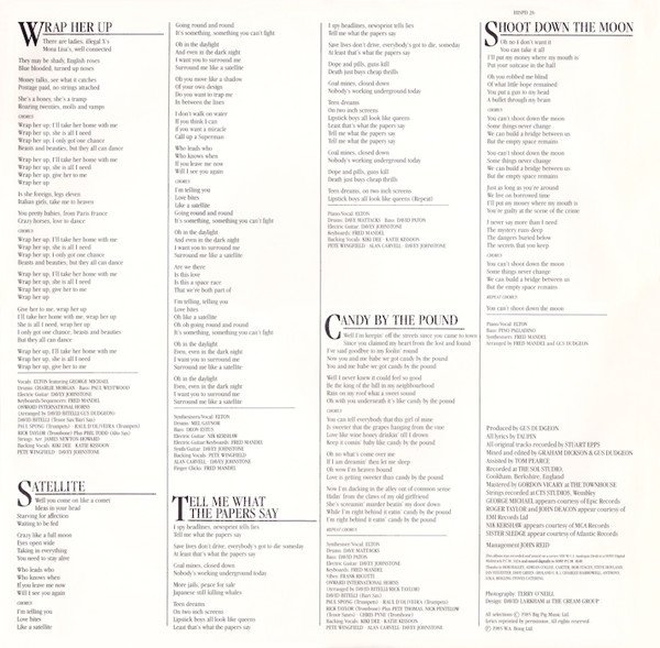 ℗ 1985 William A. Bong Ltd (labels) ℗ 1985 W.A. Bong Ltd (inner sleeve) © 1985 Rocket Records All selections © 1985 Big Pig Music Ltd Strings recorded at CTS Studios, Wembley George Michael appears courtesy of Epic Records Roger Taylor and John Deacon appear courtesy of EMI Records Ltd. Nik Kershaw appears courtesy of MCA Records Sister Sledge appear courtesy of Atlantic Records Printed inner sleeve with lyrics.