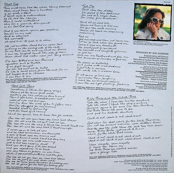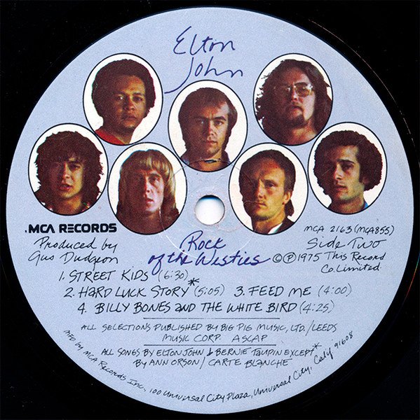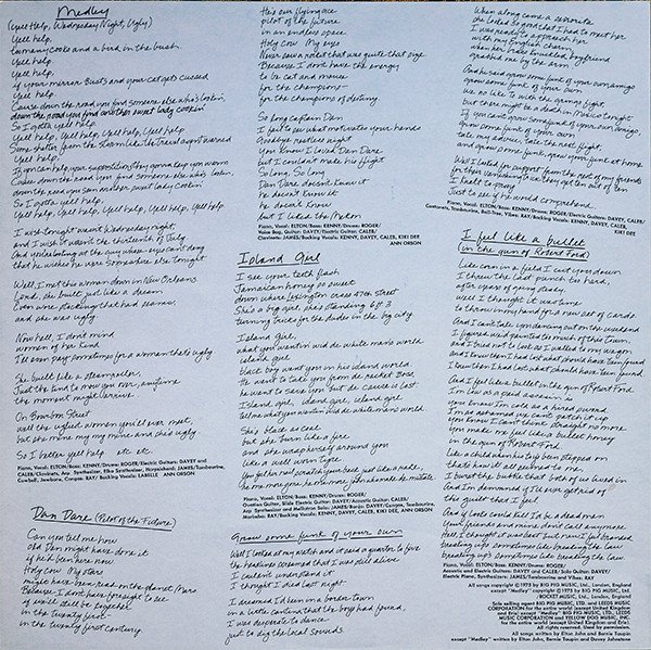 A variation exists with a gold stamped cover and with a new release # [r=4950698] This is the same as [r1022862] but pressed at [l314985], as denoted by the "▣-G-▣" in the runouts. Recorded at Caribou, Studios, Colorado Re-mixed at Trident Studios, London This album is dedicated to Nigel Olsson and Dee Murray. Thanks once again to all at the Guercios, the ladies who cook and clean at the ranch, Bob the piano-tuner, LaBelle, and Arun for mastering in his inimitable way. All songs copyright ©1975 BIG PIG MUSIC, Ltd., London England except B2 copyright ©1974 BIG PIG MUSIC, Ltd., London England except A1 ©1975 BIG PIG MUSIC, Ltd. / ROCKET MUSIC, Ltd. London England Sole selling agent BIG PIG MUSIC, LTD. and LEEDS MUSIC CORPORATION for the entire world (except United Kingdom and Erie) except A1 BIG PIG MUSIC, LTD., LEEDS MUSIC CORPORATION and YELLOW DOG MUSIC, INC. for the entire world (except United Kingdom and Erie). [a344807] and [a107701] appear by courtesy of [l12125], Ltd. [a21267] appears by courtesy of [l1005] Records. Issued with color printed photo inner cardboard sleeve & color photo/lyric insert.