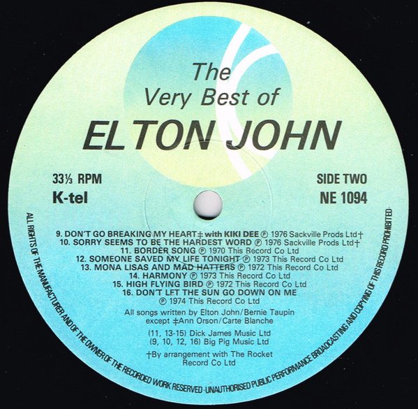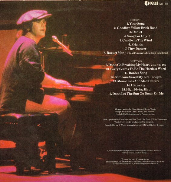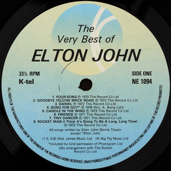 To ensure the highest quality reproduction the running times of some of the titles as originally released have been changed. This version is pressed by PRS Ltd. [url=https://www.discogs.com/release/10996499]Another version[/url] is pressed by Orlake, identifiable from runouts. [url=https://www.discogs.com/Elton-John-The-Very-Best-Of-Elton-John/release/12289601]Another version[/url] is pressed by RCA Records Pressing Plant, identifiable from runouts. ℗ 1980 K-Tel Intl. © 1980 K-Tel Intl. Publishers: A1-A3, A5-A8, B3, B5-B7: Dick James Music A4, B1, B2, B4, B8: Big Pig Music Ltd Song for Guy included by kind permission of Phonogram Ltd. By arrangement with The Rocket Record Co Ltd. (P) 1978 Wm. A. Bong Ltd. Produced for Frank N Stein Productions. (P) This Record Co Ltd A1, B3: 1970 A2, A5, B4, B6: 1973 A3, A8, B5, B7: 1972 A6, A7: 1971 B8: 1974 B1, B2: (P) 1976 Sackville Prods Ltd. By arrangement with The Rocket Record Co Ltd. Compiled in association with DJM and Rocket Records.