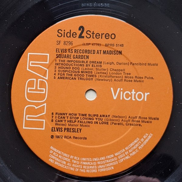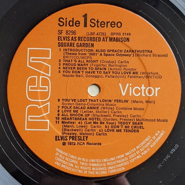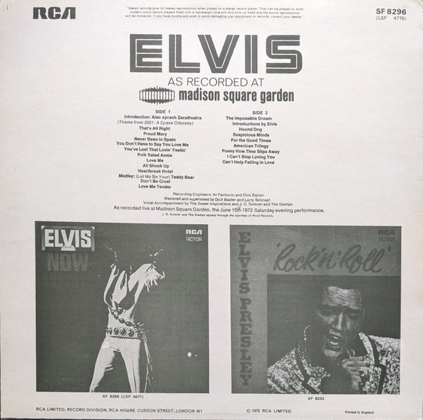 As recorded live at Madison Square Garden, the June 10th 1972 Saturday evening performance.RCA on rear cover and RCA Victor on labels and spine. Stereo appears at the top of the labels and a black circle S on the spine.