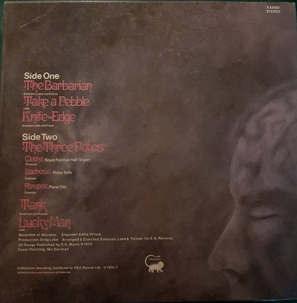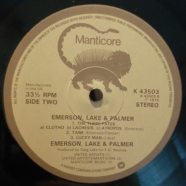 A Manticore Recording, distributed by WEA Records Ltd. Ⓟ 1970 SHOREPARK by Shorewood Packaging Co. Ltd., ENGLAND Label variant with "Manufactured in the UK" on the left side on the label and B1 tracklisting on a single line. Later circa 1974/75 issue, with brown only print labels.